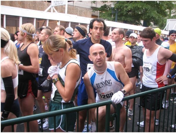 The drive was uneventful, but I could have done without the rain. Visibility wasn’t great but at least there wasn’t much traffic on the road at that time of the morning. We arrived in plenty of time and found a place to park several blocks north of the start area/host hotel. Packet pickup was smooth and before I knew it I was checking my gear onto the baggage truck and lining up at the start line just several rows back from the elite runners.